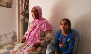 Rimel El-Haji, mother of a nine-year-old girl, Nariman, affected by the plant’s emissions, sits with her daughter inside their home during an interview with Reuters, in Gabes, Tunisia October 16, 2025. REUTERS/Jihed Abidellaoui