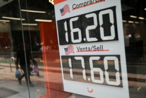 FOTO DE ARCHIVO. Un tablero, que muestra los tipos de cambio del peso mexicano frente al dólar estadounidense, es visto en una oficina bancaria en Ciudad de México, México. 5 de julio de 2023. REUTERS/Henry Romero