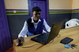 Alexis Kango, director of the NGO LIMPIA which has tried to promote mixed marriages in Duekoue since 2010-2011 by forming youth groups where couples get help resolving disputes, looks for photos of recent mixed marriages on his computer in Duekoue, Ivory Coast, October 4, 2025. REUTERS/Luc Gnago
