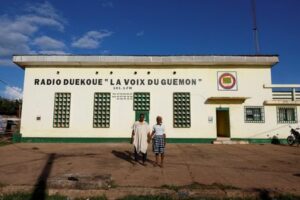 Matinez Pode, from the Guere ethnic group, and his wife Elisabelle Kouadio Ahou, from the Baoule community, both from the two communities formerly opposed during the civil war and the post-election crisis, stand next to a local radio station during a walk in Duekoue, Ivory Coast, October 3, 2025. REUTERS/Luc Gnago