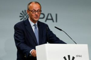Bundeskanzler Friedrich Merz spricht während des ersten Spatenstichs für den IPAI CAMPUS, einen Park für künstliche Intelligenz, in Heilbronn, Deutschland, 21. Oktober 2025. REUTERS/Heiko Becker