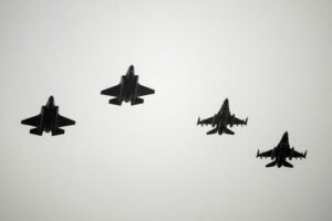 FILE PHOTO: Two F-16 and two F-35 fighter jets return to air base Flyvestation Skrydstrup after patrolling around Denmark at low altitude, as the Danish air base officially receives four F-35 fighter jets on October 1, 2023. Ritzau Scanpix/Bo Amstrup via REUTERS/File Photo