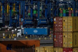 A heavy goods vehicle moves amongst shipping containers at the Port of Felixstowe in Felixstowe, Britain, February 17, 2025. REUTERS/Chris J. Ratcliffe