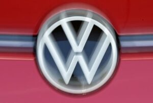 ARCHIV: Das VW-Logo ist in der Endkontrolllinie des Elektroautos ID. 3 während einer Medientour in Dresden, Deutschland, am 14. Mai 2025. Das Bild wurde mit einem Vario-Objektiv aufgenommen. REUTERS/Matthias Rietschel
