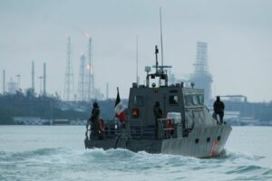Imagen de archivo. Miembros de la Armada de México patrullan en una embarcación a lo largo del puerto marítimo durante un operativo para reforzar la vigilancia, en medio del creciente tráfico de combustible de México a Estados Unidos, en Ciudad Madero, México. 28 de mayo de 2025. REUTERS/Daniel Becerril