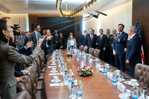 U.S. Vice President JD Vance and Israel’s Prime Minister Benjamin Netanyahu speak with members of the media during a meeting at the Prime Minister’s Office in Jerusalem October 22, 2025. Nathan Howard/Pool via REUTERS