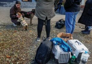 A woman reacts as people gather near residential buildings damaged during a Russian drone and missile strike, amid Russia’s attack on Ukraine, in Kyiv, Ukraine October 22, 2025. REUTERS/Alina Smutko