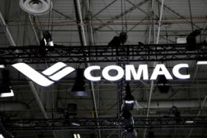 FILE PHOTO: Commercial Aircraft Corp of China (COMAC) logo at the 55th International Paris Airshow at Le Bourget Airport near Paris, France, June 18, 2025. REUTERS/Benoit Tessier/File Photo