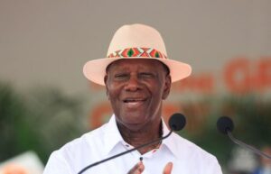Ivory Coast’s President Alassane Ouattara, 83, who is seeking a fourth term, speaks during a campaign rally of the women of RHDP (Rally of Houphouetists for Democracy and Peace), ahead of the Ivory Coast presidential election scheduled on October 25 in Abidjan, Ivory Coast, October 19, 2025. REUTERS/Luc Gnago