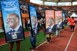 Supporters of Ivory Coast’s President Alassane Ouattara, who is seeking a fourth term, hold his posters during a campaign rally of the young people of RHDP (Rally of Houphouetists for Democracy and Peace), ahead of Ivory Coast presidential election scheduled for October 25, in Abidjan, Ivory Coast, October 18, 2025. REUTERS/Luc Gnago