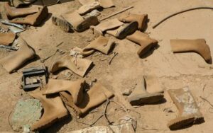 Safety shoes are scattered in a destroyed factory in Omdurman