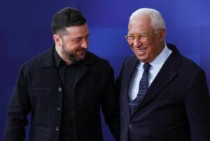El presidente ucraniano Volodímir Zelenski y el presidente del Consejo Europeo António Costa llegan a la Cumbre de Líderes de la UE en Bruselas, Bélgica. 23 de octubre de 2025. REUTERS/Yves Herman