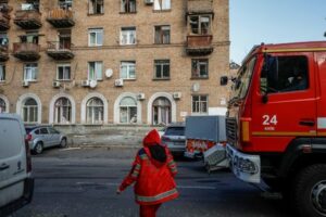A medic walks near a residential building damaged during a Russian drone and missile strike, amid Russia’s attack on Ukraine, in Kyiv, Ukraine October 22, 2025. REUTERS/Alina Smutko