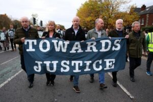 People hold a banner while families of victims of the 1972 ‘Bloody Sunday’ killings gather, as a judge is expected to give a verdict on the trial of the British army veteran known as ‘Soldier F’, charged with two murders and five attempted murders in relation to Bloody Sunday, in Belfast, Northern Ireland, October 23, 2025. REUTERS/Cathal McNaughton