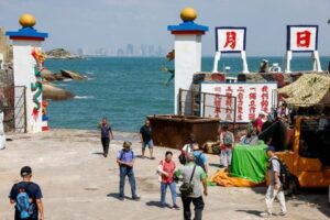 Tourists gather at the port and entrance of Dadan, with China’s Xiamen visible in the background, on Dadan Island, in Kinmen, Taiwan, October 18, 2025. REUTERS/Ann Wang