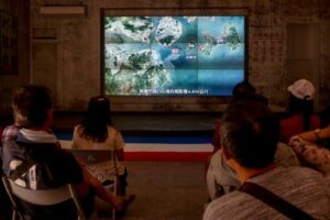 Visitors watch an introductory video about Dadan Island upon arrival at the visitor center, on Dadan Island, in Kinmen, Taiwan, October 18, 2025. REUTERS/Ann Wang