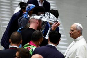 A person gives a Palestinian keffiyeh to Pope Leo XIV on a day of the meeting with participants in the World Meeting of Popular Movements in the Paul VI hall, at the Vatican, October 23, 2025. REUTERS/Yara Nardi