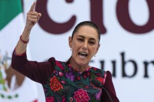 La presidenta de México, Claudia Sheinbaum, pronuncia un discurso con motivo de su primer año en el cargo, informando sobre las acciones de gobierno incluidas en su primer discurso sobre el Estado de la Unión, ante simpatizantes y funcionarios de gobierno en la Plaza del Zócalo, en Ciudad de México, México, 5 de octubre de 2025. REUTERS/Toya Sarno Jordan