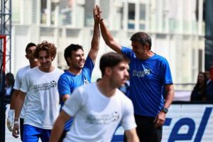 El piloto Sergio Pérez y el empresario Arturo Elías Ayub chocan sus manos durante un partido de fútbol previo al Gran Premio de la Ciudad de México. Plaza Carso, Ciudad de México, México. 23 de octubre de 2025.