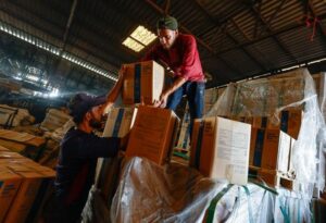 Palestinos manipulan suministros de ayuda que entraron en Gaza, en medio de un alto el fuego entre Israel y Hamás en Gaza, en Zawaida, en el centro de la Franja de Gaza. 21 de octubre de 2025. REUTERS/Mahmoud Issa
