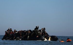 FOTO DE ARCHIVO. Un grupo de migrantes a bordo de una lancha neumática hace gestos a los migrantes que nadan en el mar antes de abandonar la costa del norte de Francia en un intento de cruzar el Canal de la Mancha para llegar a Reino Unido, desde la playa de Petit-Fort-Philippe en Gravelines, cerca de Calais, Francia. 25 de agosto de 2025. REUTERS/Hannah McKay