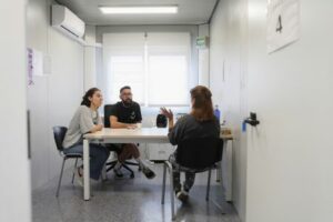 Dos psicólogos atienden a un paciente dentro de un módulo de la Unidad de Emergencias de Salud Mental (USME), una iniciativa del Ministerio de Sanidad y puesta en marcha por la Fundación Manantial, en Catarroja, cerca de Valencia, España, 14 de octubre de 2025. REUTERS/Eva Manez