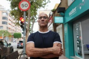 José Manuel González Castán, de 58 años, que recibe tratamiento para el trastorno de estrés postraumático tras las graves inundaciones de octubre de 2024, posa frente al semáforo en el que se posó durante más de ocho horas para salvar su vida, en Alfafar, cerca de Valencia, España, 9 de octubre de 2025. REUTERS/Eva Manez