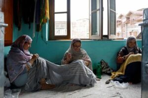 Handicraft artisans work on Sozni, a traditional needlepoint embroidery, on shawls at a workshop in Srinagar, Indian Kashmir, October 3, 2025. REUTERS/Sharafat Ali