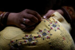 Maimoona Jan, 42, works on Sozni, a traditional needlepoint embroidery, on a shawl at a workshop in Srinagar, Indian Kashmir, October 3, 2025. REUTERS/Sharafat Ali