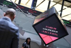 FOTO DE ARCHIVO: Infornación bursátil desplegada en las pantallas de la sede de LSEG (London Stock Exchange Group) en Londres, Reino Unido. 25 abril 2025. REUTERS/Toby Melville