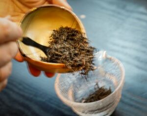 A view shows tea leaves in a bowl and a cup in a tea house in this picture illustration taken April 25, 2020. REUTERS/Shamil Zhumatov/Illustration