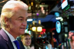 Dutch Party for Freedom (PVV) leader Geert Wilders waits for an order of fish, as he attends a meet and greet in the run-up to the House of Representatives elections, in Volendam, Netherlands, October 25, 2025. REUTERS/Piroschka van de Wouw