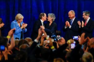 President-elect Catherine Connolly receives congratulations from her husband Brian McEnery as Presidential candidate Fine Gael’s Heather Humphreys, Irish Taoiseach (Prime Minister) Micheal Martin and Irish Tanaiste (Deputy Prime Minister) Simon Harris applaud her at Dublin Castle, on the day of the announcement of the results of the Irish presidential election in Dublin, Ireland, October 25, 2025. REUTERS/Clodagh Kilcoyne