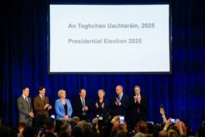 President-elect Catherine Connolly stands next to Irish Taoiseach (Prime Minister) Micheal Martin, her husband Brian McEnery, Presidential candidate Fine Gael’s Heather Humphreys, Irish Tanaiste (Deputy Prime Minister) Simon Harris and other officials at Dublin Castle, on the day of the announcement of the results of the Irish presidential election in Dublin, Ireland, October 25, 2025. REUTERS/Clodagh Kilcoyne
