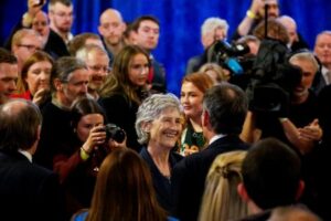 President-elect Catherine Connolly receives congratulations as she walks at Dublin Castle, on the day of the announcement of the results of the Irish presidential election in Dublin, Ireland, October 25, 2025. REUTERS/Clodagh Kilcoyne