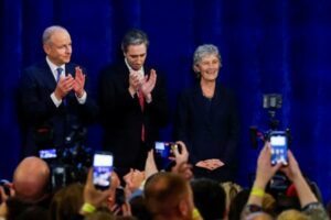 President-elect Catherine Connolly is applauded by Irish Taoiseach (Prime Minister) Micheal Martin and Irish Tanaiste (Deputy Prime Minister) Simon Harris at Dublin Castle, on the day of the announcement of the results of the Irish presidential election in Dublin, Ireland, October 25, 2025. REUTERS/Clodagh Kilcoyne