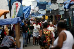 Varias personas pasean por el mercado de Coronation ante la llegada de la tormenta tropical Melissa, que se espera que traiga lluvias torrenciales y fuertes vientos a la zona, en Kingston, Jamaica. 25 de octubre de 2025. REUTERS/Octavio Jones