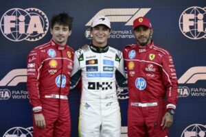 Lando Norris (centro) sonríe junto a Charles Leclerc y Lewis Hamilton tras quedarse con la pole position en el Gran Premio de la Ciudad de México. Autódromo Hermanos Rodríguez, Ciudad de México, México. 25 de octubre de 2025.