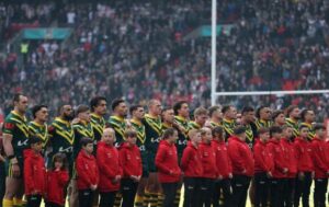 Rugby League – England v Australia – First Test – Wembley Stadium, London, Britain – October 25, 2025 Australia players line up during the national anthems before the match Action Images via Reuters/John Sibley