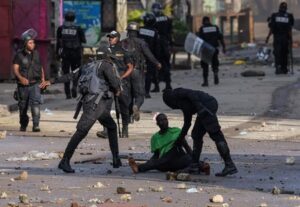 Riot police officers detain a supporter of Cameroon presidential candidate Issa Tchiroma, who claimed victory in the October 12 presidential election, during a protest in New Bell neighbourhood in Douala, Cameroon October 26, 2025. REUTERS/Zohra Bensemra