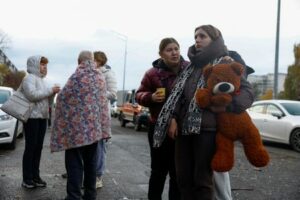 Residents stand next to their apartment building damaged during an overnight Russian drone strike, amid Russia’s attack on Ukraine, in Kyiv, Ukraine October 26, 2025. REUTERS/Valentyn Ogirenko