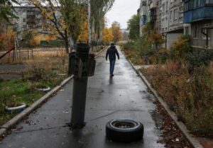 Un residente camina cerca de una parte de un misil ruso en la ciudad de Dobropillia, en la línea del frente, en medio del ataque de Rusia contra Ucrania, en la región de Donetsk, Ucrania. 27 de octubre 2025. REUTERS/Anatolii Stepanov