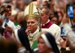 FILE PHOTO: Pope Leo XIV arrives to lead the Mass for the Jubilee of Synodal Teams and Participatory Bodies at St. Peter’s Basilica in the Vatican, October 26, 2025. REUTERS/Yara Nardi/File Photo