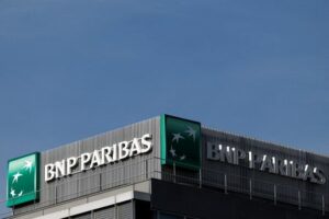 ARCHIV: Das Logo von BNP Paribas vor einem Bankgebäude in Rueil-Malmaison bei Paris, Frankreich, am 14. April 2025. REUTERS/Stephanie Lecocq/Archivfoto