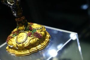 A gold chalice decorated with emeralds and rubies from the “Treasure of San Gennaro” collection, assembled from papal and royal donations, is displayed at the Museum of the Treasure of San Gennaro in Naples, Italy October 23, 2025. REUTERS/Ciro De Luca