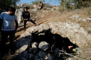 People inspect next to a cave at the site where Israeli forces killed three Palestinians, near Jenin, in the Israeli occupied West Bank October 28, 2025. REUTERS/Raneen Sawafta