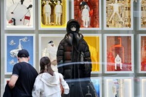 FILE PHOTO: People look at a Moncler store window in