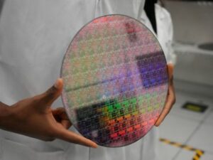 FILE PHOTO: A silicon wafer with chips etched into is seen at a site where Applied Materials plans to build a research facility, in Sunnyvale, California, U.S., May 22, 2023. Jim Wilson/Pool via REUTERS/File Photo
