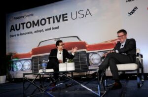 Lucid Motors Interim CEO Marc Winterhoff speaks with Reuters U.S. Autos correspondent Abhirup Roy during the Reuters Automotive USA event in Detroit, Michigan, U.S. October 29, 2025. REUTERS/Rebecca Cook