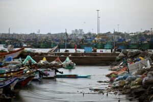 A man covered with a raincoat walks past fishing boats moored at a fishing harbour as it drizzles, before Cyclone Montha makes landfall, in Chennai, India, October 28, 2025. REUTERS/Riya Mariyam R